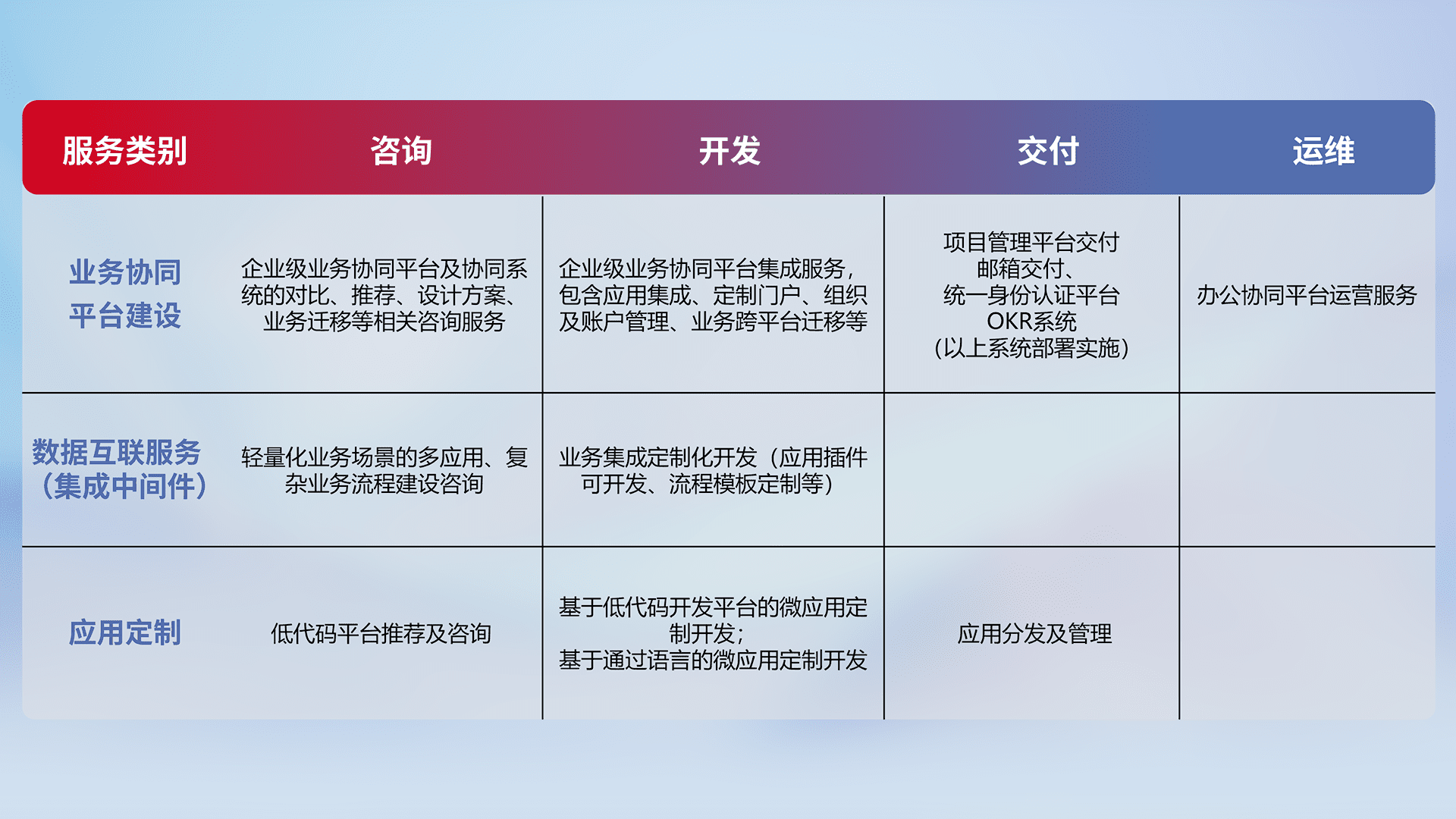针对钉钉、、、、企微、、IDaas等平台级产品提供产品的规划、、方案、、交付、、、、定制化开发等服务,,实现如统一协同办公、、、智能客户服务、、混合会议管理、、、智能数据查询、、等业务场景,,,,实现数字化转型。。。。