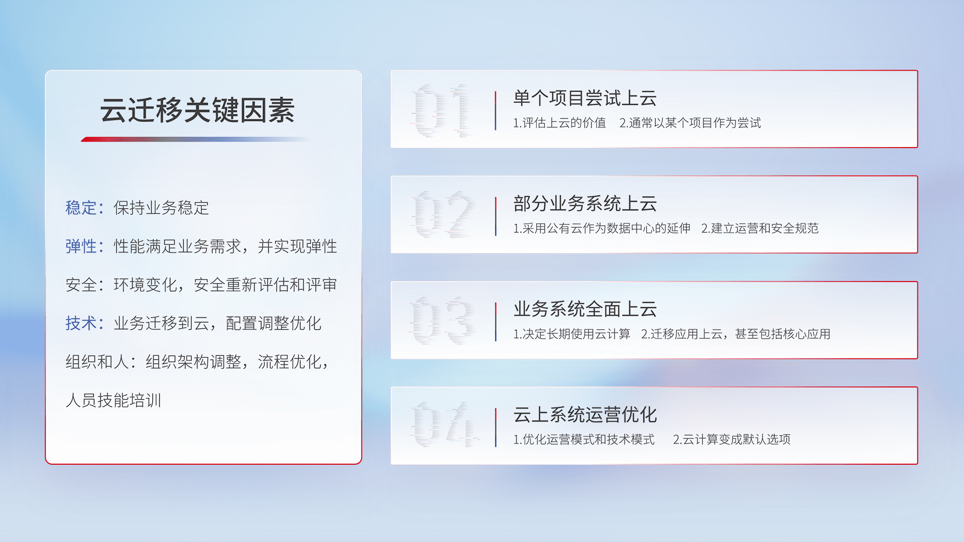 结合实际业务,,,从规划设计、、、、云平台选型、、云原生改造、、、数据迁移、、、集成交付,,迁移全过程为客户识别最佳上云路径,,做好风险识别管理,,设计网络架构、、、身份权限、、安全审计合规、、操作审计、、、、日志审计、、、监控告警策略、、、多站点容灾设计等,,,,对云上基础设施进行整体规划,,提升IT治理水平,,,,以满足弹性、、、、高可用、、、、高性能的需求。。。。