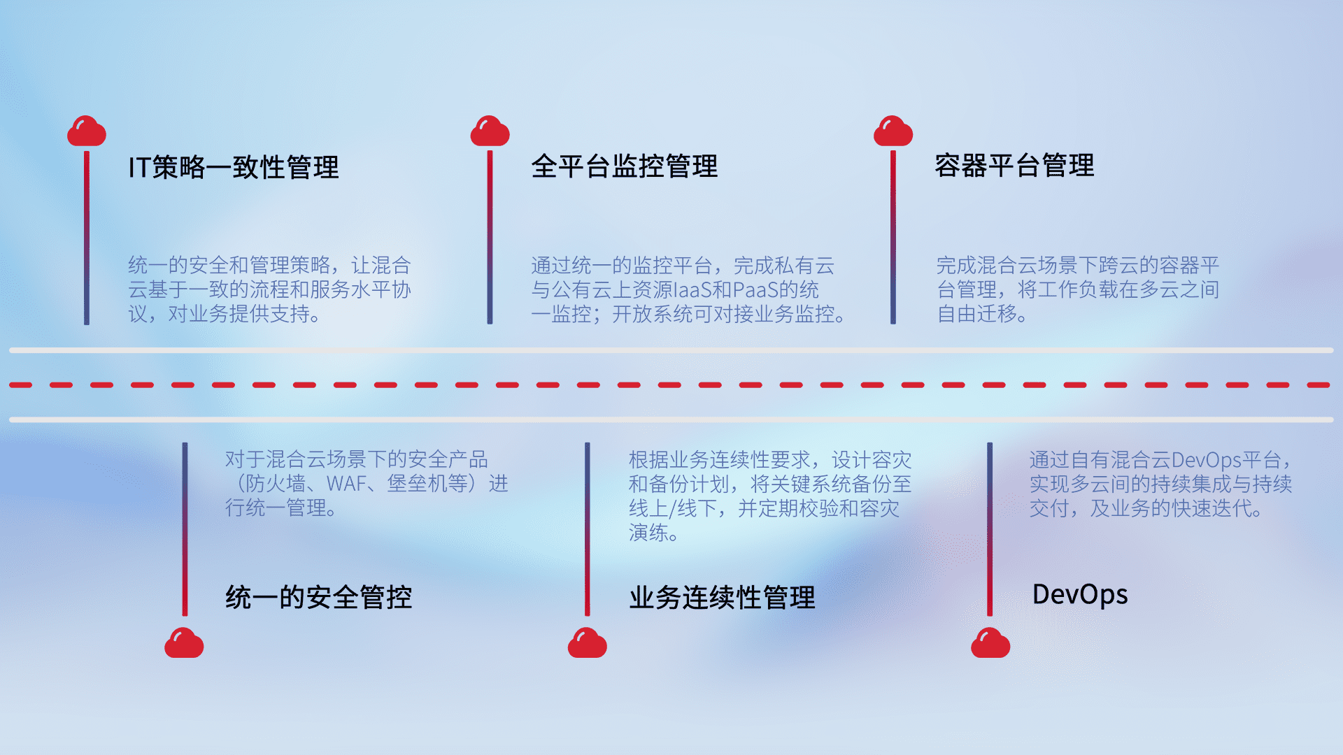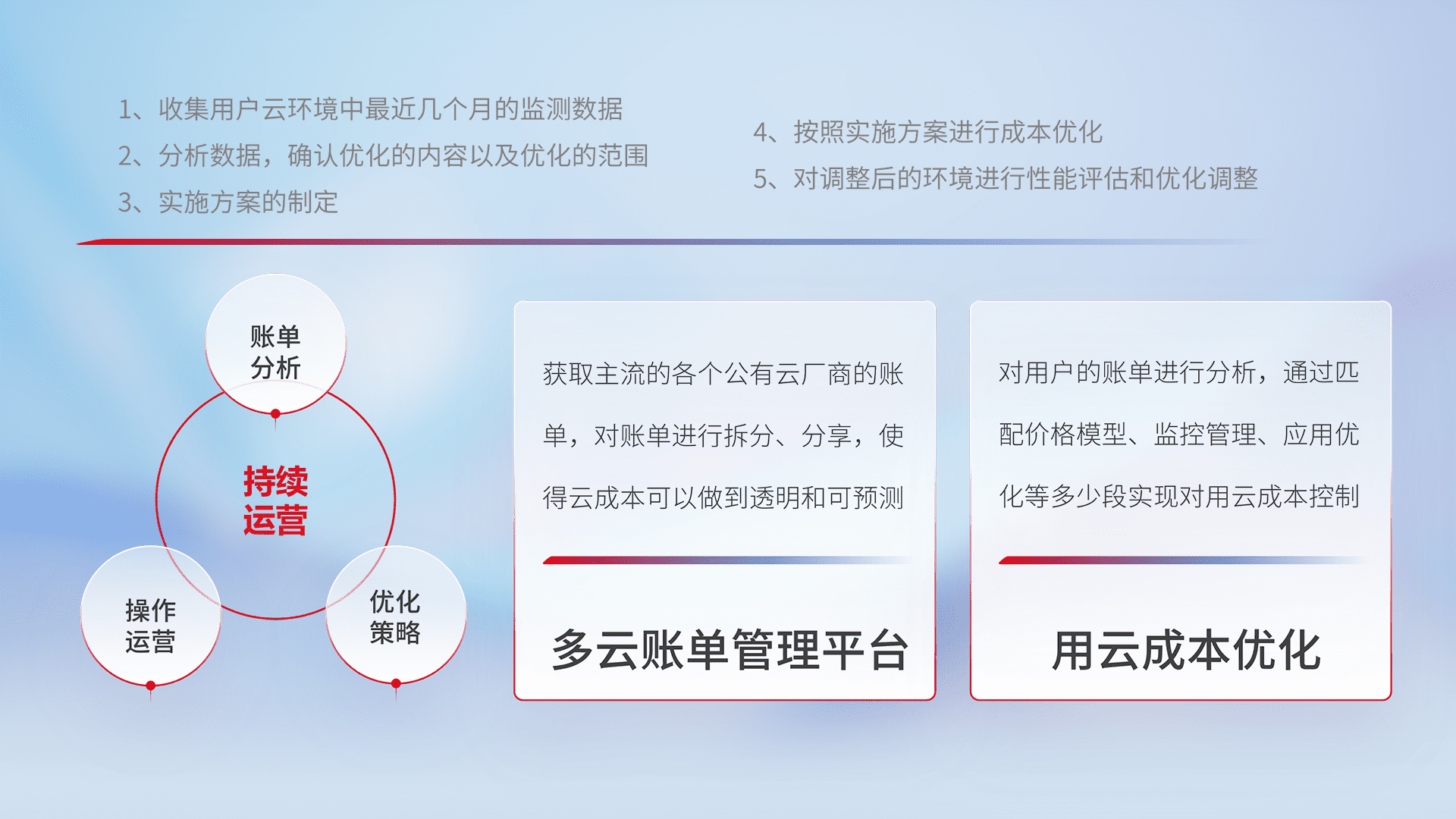 通过多云纳管,,以统一的资源数据模型把客户的云资源进行抽象和封装,,,,进而实现对多云资源的统一操作,,保障云资源管理的可靠性、、、稳定性与可用性。。。量身定制化运维内容,,,配置、、、、开发运维、、、补丁管理、、、备份、、、、监控、、认证和访问管理、、、审计和日常巡检等,,,保障在用云过程中的可靠度,,,稳定度以及高可用率。。。。